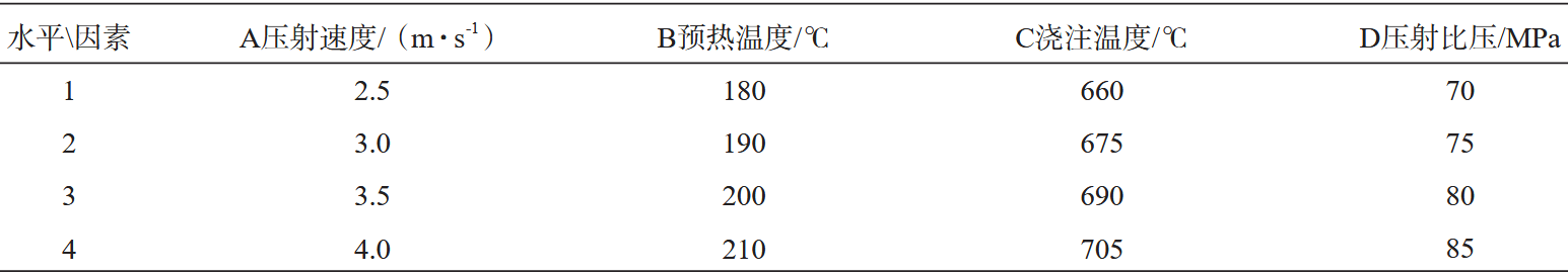 基于章节2.1与章节2.2的分析,并结合实际生产经验,选取四个对铸件质量有重要影响的压铸工艺参数进行正交试验,分别为:压射速度(A)、模具预热温度(B)、合金液浇注温度(C)以及压射比压(D),建立正交试验因素水平表及试验方案,如表3所示。