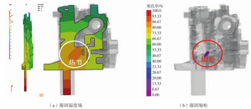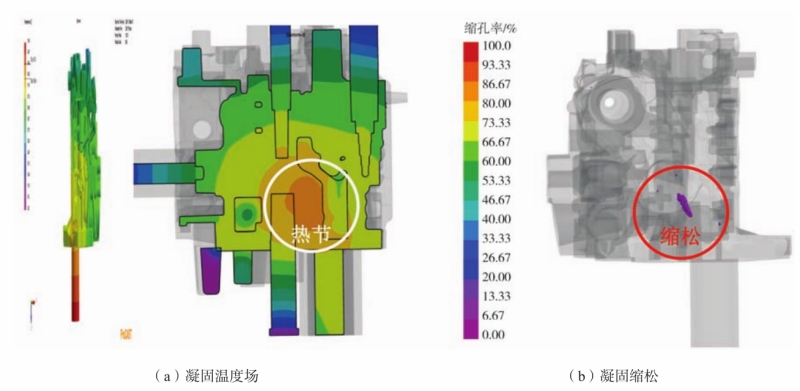图7(a)给出了铸件的内部温度场,在靠近升液管一端的铸件内部存在较多型芯,型芯在此局部区域累积了较多热量,导致该处出现较大热节。这一内部热节导致该处部位出现了缩松缺陷,如图7(b)。因此,结合数值模拟结果,对设计的低压铸造工艺参数进一步优化,以期消除该部位的铸造缺陷,获得更佳的低压铸造工艺方案。