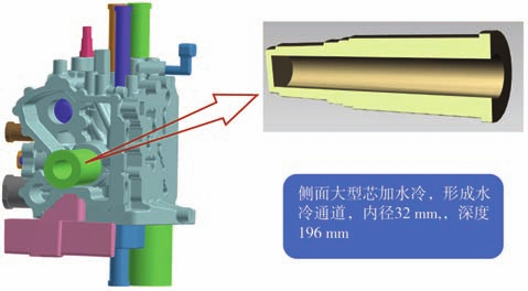 分析发现,在热节处附近存在一大尺寸型芯,若能增强该型芯对铸件的冷却效果,对铸件内部热节部位处的热量进行强制散热,进而可消除热节所造成的缩松缺陷。本文通过在侧面大型芯上引入水冷通道,将该处型芯的换热方式由原来的空冷改为水冷[换热系数等效为5 000 W/(m²·K)]的方式达到这一目的。图9示出了优化后的型芯结构图。 此外,进一步调整模具温度,将下金属模具温度继续调高至400 ℃,A处模具温度降为280 ℃,B处模具温度降为200 ℃。优化后的充型凝固温度场及凝固相场如图10所示。从充型凝固温度场可以看出,金属液充型平稳,且为自上而下的顺序凝固,并且升液管内金属液在整个充型凝固过程提供了足够的热流,保证了压力的持续作用。由凝固相场可以看到,凝固起始于铸件外壳,在凝固过程中,铸件内部得到了良好的补缩,并无孤立的液相区存在,在凝固时间为258 s时,铸件基本完全凝固,最终的凝固时间为265 s,除去升液时间、充型时间和增压时间,保压时间作用240 s即可,这样不仅可以保证铸件整体质量,而且可以使升液管内的金属液大部分回流。