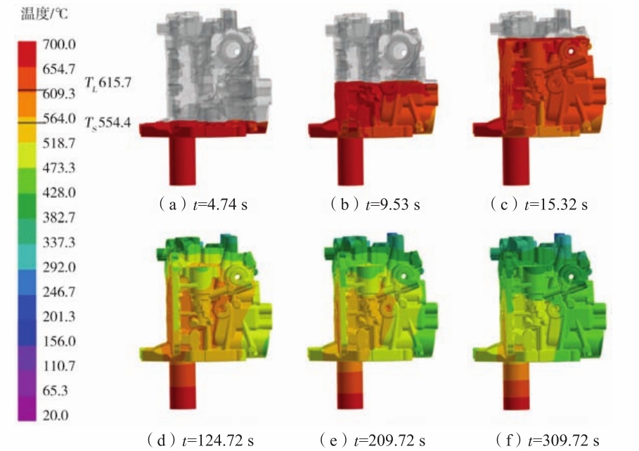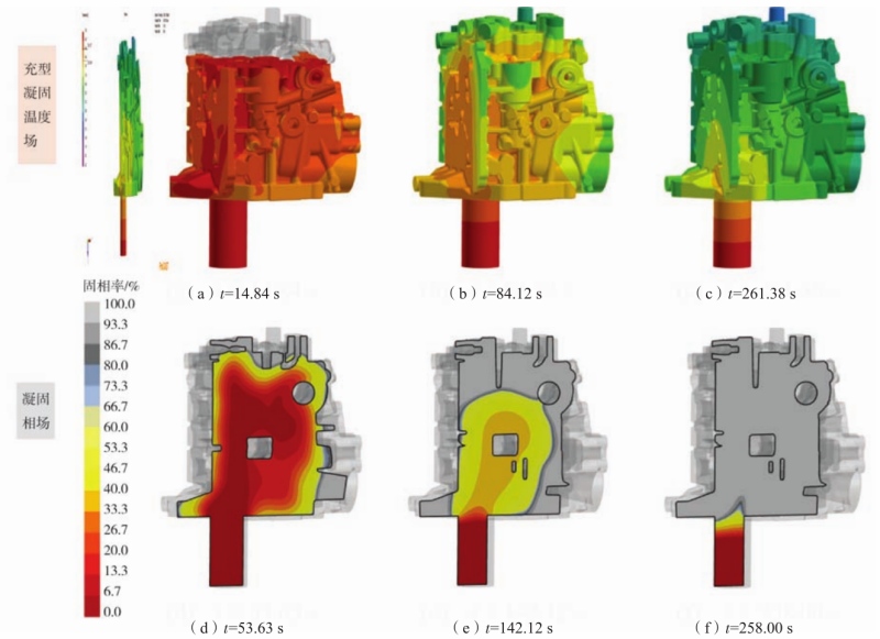 根据前文设计的低压铸造工艺参数,得到了该型铸件充型与凝固的数值模拟结果,见图6。充型过程中金属液充型平稳,无卷气、紊流出现。在凝固阶段,其凝固顺序自上而下向升液管部位推进,且在铸件凝固过程中,升液管中的金属液始终未凝固,保压压力可以持续作用于铸件,说明前文设计的参数基本合理。