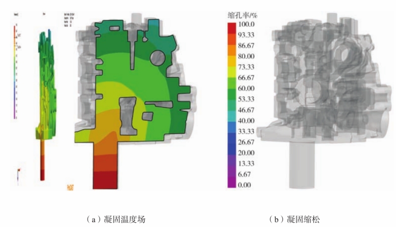 图11所示为相应的铸件进行缺陷预测结果。铸件内部温度场结果显示,大尺寸型芯处热节成功转移至升液管中,铸件内部已无热节产生。图11(b)所示铸件缩松、缩孔分析结果表明,铸件内部孔隙类缺陷消失。