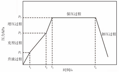 在低压铸造工艺中影响铸件质量的一个关键参数便是充型速度。根据低压铸造过程中的压力特征可将低压铸造细分为如图3所示的5个过程,即金属液在升液管中的升液过程、充型过程、金属液结壳和结晶的增压过程、凝固保压过程以及卸压过程。