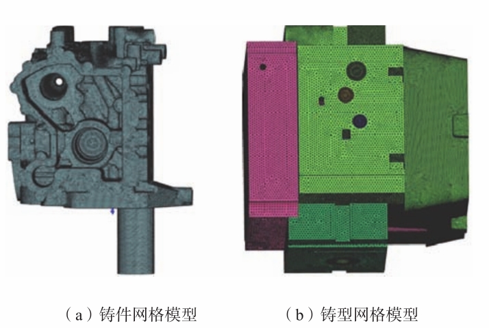采用UG软件进行铸件和铸型的三维建模,以.x_t格式导入ProCAST模拟软件中。图4为面网格和体网格划分后的铸件与铸型网格模型,面网格总数为1 385 794个,体网格总数为14 094 126个。金属液的浇注温度为700 ℃ ,保温套温度为25 ℃;保温套与铸件之间的换热系数为100 W/(m²·K),铸型、型芯与铸件之间的换热系数分别为1000 W/(m²·K)和300 W/(m²·K)。