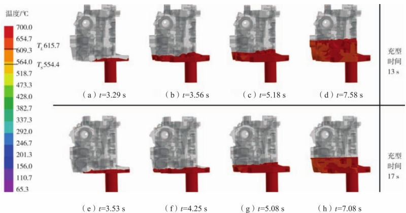 图5为金属液充型模拟结果。可以看到,采用预估充型速度进行充型,在充型阶段初期[图5(b)和图5(c)],金属液的流动出现了一定程度的紊流,之后消失,这主要是因为升液管内的金属液以较高速度进入型腔时受到了型腔内部较多型芯的扰动。之后降低充型阶段的增压速度,将充型时间延长至17 s。可以发现,金属液在整个充型过程中的流动变得较为平稳,由此设定该铸件低压铸造工艺数值模拟的充型时间为17 s。