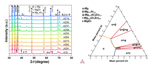 ►相组成:随着Al/Zn比例降低,合金中析出相由连续网状Mg₁₇Al₁₂ 逐渐转变为孤立块状MgZn,中铝中锌合金(如AZ64–AZ28)中则形成Mg-Al-Zn三元金属间化合物。