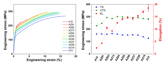 ►强塑性匹配:中Al/Zn比合金(AZ64-AZ37) 表现出最优综合性能:YS > 153 MPa,UTS > 294 MPa, elongation > 12%。