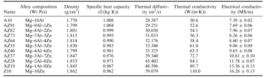 Mg-Al-Zn合金物性数据与导热/导电性能