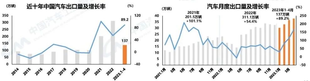 汽车出口持续迅猛增长 4月,汽车企业出口37.6万辆,环比增长3.3%,同比增长1.7倍。1-4月,汽车企业出口137万辆,同比增长89.2%。