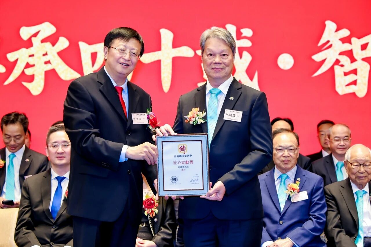 香港铸造业总会为永远名誉主席、会长、常务副会长等总会成员颁发襟章 晚宴上,总会向为行业做出杰出贡献的个人和团体颁发了多项荣誉奖项。其中,江汉波先生因其在总会40周年特刊编撰中的卓越贡献荣获“匠心贡献奖”;多位长期服务于总会的架构荣获“四十年服务奖”和“三十年服务奖”;同时,还颁发了“薪火铸业奖”“铸才竞技组织奖”等,以表彰在行业传承、人才培养等方面做出突出贡献的个人和企业。此外,会上还为“铸青培训基金”颁发感谢状,感谢基金创立者、永远荣誉会长梁焕操先生,以及慷慨解囊的爱心企业家们。