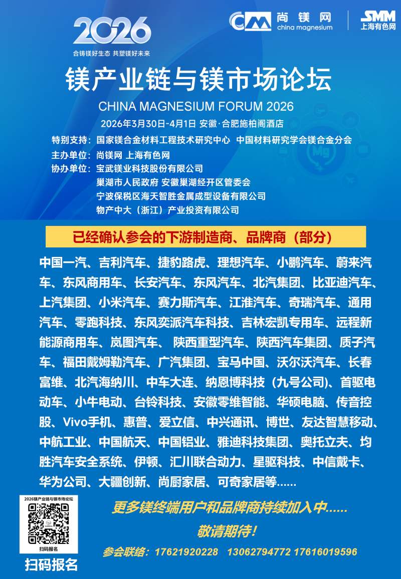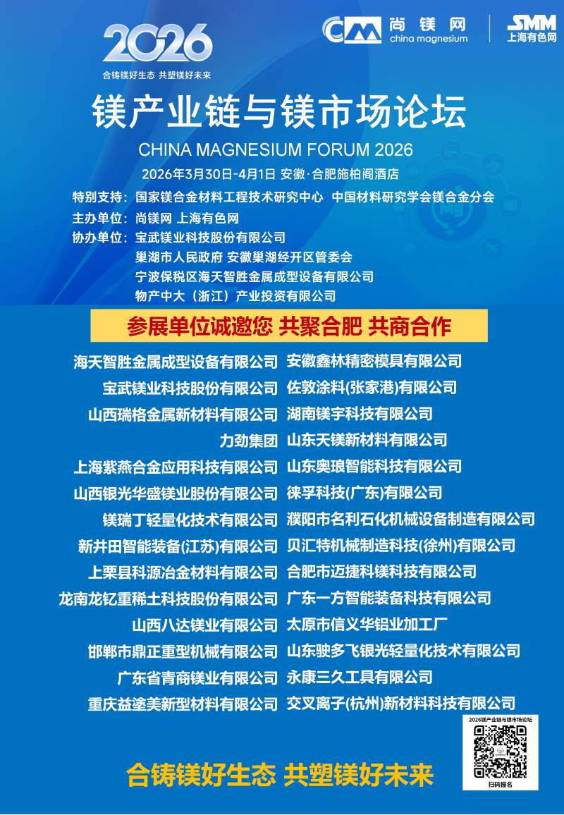 2026年的镁行业,正站在供需改善、需求爆发、政策加持的关键拐点,一场属于镁合金的春天正在到来。春光不等人,商机不重来。当下正是布局镁产业链、锁定订单、拓展渠道、升级技术的黄金窗口期。值此时刻,"2026镁产业链与镁市场论坛"将于3月30日-4月1日在合肥市盛大启幕。论坛由国家镁合金材料工程技术研究中心、中国材料研究学会镁合金分会特别支持,尚镁网、上海有色网联合主办,宝武镁业科技股份有限公司、巢湖市人民政府、安徽巢湖经开区管委会、宁波保税区海天智胜金属成型设备有限公司、物产中大(浙江)产业投资有限公司等单位协办,得到了镁产业链众多骨干企业的支持和参与。这将是本论坛连续第四年举行。