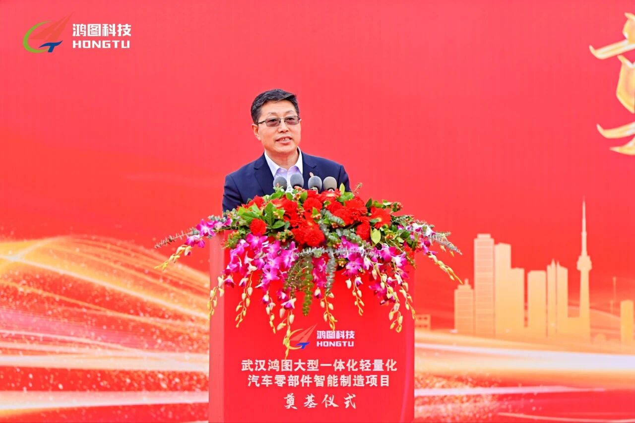 广东鸿图党委书记、董事长刘卫东致辞 广东鸿图党委书记、董事长刘卫东在奠基仪式上,对各级政府及合作伙伴的支持表示感谢。他表示,武汉是汽车工业重要战略高地,十二年前鸿图布局武汉已实现深度融合;此次二期项目是响应国家“双碳”战略、顺应汽车产业发展趋势的关键举措,将引入超大型一体化压铸装备与核心技术,把武汉基地打造为全国重要增长极,助力武汉“世界车谷”建设。
