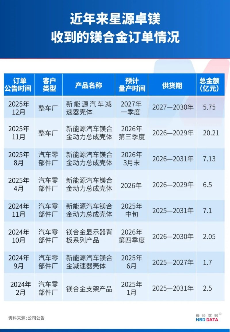 从白云石(一种以碳酸钙镁为主要成分的天然矿物)资源开采、冶炼提纯、合金配方优化,到半固态成型等核心工艺,我国已经实现了全链条关键环节的自主可控,不存在被海外“卡脖子”的风险,供给稳定性和安全性极高。 这种全产业链的掌控力,意味着当汽车行业的需求爆发时,国内能够迅速响应,形成规模效应,进一步巩固成本优势。“汽车行业是镁合金的绝对消费主力,占比高达70%,主要用于仪表板支架、座椅骨架、方向盘等部件,正开辟全新的增长曲线。”广西汽车集团方面称。 面对这一历史性机遇,国内产业链各环节的企业已开始加速布局。在上游,宝武镁业已形成完整的产业链闭环。 五矿证券研报提到,截至2025年4月底,宝武镁业拥有10万吨原镁产能及20万吨镁合金产能。另外,公司在周湖新建5万吨原镁产能,在五台新建10万吨原镁和10万吨镁合金,在青阳新建25万吨原镁和30万吨镁合金产能。新建产能投入后,合计原镁和镁合金将会分别达到50万吨和60万吨。 在中游制造端,一批技术壁垒高、成长性强的企业正成为价值高地。星源卓镁深耕高端镁铝压铸领域,其产品已应用于宝马、奥迪、保时捷、蔚来等多个品牌。春秋电子则从消费电子结构件领域跨界而来,凭借在镁铝结构件加工精度、速度和良率上的优势,已切入小米、蔚来、小鹏、比亚迪等车企的供应链。 东兴证券在其研报中预测,全球汽车行业镁合金需求将从2025年的42.1万吨增长至2028年的106.1万吨,年均复合增长率高达36%。