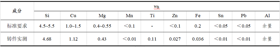 图1:摇臂壳体铸件三维模型 2、试验材料与方法 铸件采用ZL105A合金,化学成分符合GB/T 1173-2013的要求。采用电阻炉进行合金熔炼,将高纯铝、Al-12Si、Al-50Cu中间合金放入铸铁坩埚,850 ℃保温至完成熔化后,搅拌30 min;降温至700 ℃,加入纯Mg,将熔体搅拌15 min。采用不同质量分数[0.6%、0.78%的精炼剂(C2Cl6)]和Ar精炼喷吹20 min的方式对熔体进行除气、除渣,加入Al-5Ti-1B丝进行细化处理,采用砂型低压铸造进行生产,得到的铸件化学成分见表1。