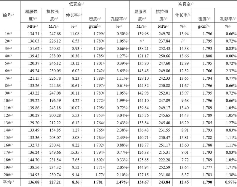 图5 镁合金副车架铸件X光照片 2.2 室温力学性能 镁合金副车架铸件不同位置室温拉伸力学性能与密度、孔隙率见表3。高真空压铸件的平均室温屈服强度为134.67 MPa、抗拉强度为243.84 MPa、伸长率为12.45%;平均密度为1.790 g/cm3,平均孔隙率为1.47%。低真空压铸件的平均室温屈服强度为136.08 MPa、抗拉强度为227.21MPa、伸长率为8.36%;平均密度为1.781 g/cm3,平均孔隙率为0.97%。与低真空压铸相比,高真空压铸条件下,副车架屈服强度稍有下降(-1.03%),抗拉强度(+7.32%)、伸长率(+48.93%)、密度(+0.51%)均明显提升,其中伸长率提高最为显著,增幅接近50%,即高真空能够显著提高镁合金铸件的塑性;孔隙率绝对值下降0.50%,降幅为33.83%。