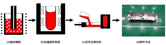 图1 Al-Si-Mg铝合金构件半固态流变压铸成形流程示意图及铸件