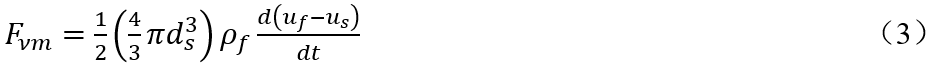 式中, 虚拟质量力Fvm也称附加重力,是当颗粒做变速运动时,带动周围流体速度发生变化,除了颗粒变速运动消耗流体速度改变需要的功等同于对颗粒施加了一个“虚拟质量”,其数值等于被它排除的流体质量的一半。对球形颗粒与流体做相对变速运动时,虚拟质量力Fvm可以定量计算为: