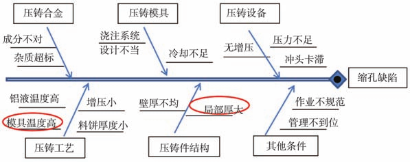 2.1 缩孔产生原因 2.2 下缸体缩孔成因分析 根据上述缩孔缺陷产生的鱼骨图,利用UG设计软件、AnyCasting数值模拟分析软件对产品结构及模具设计进行分析,借助压铸机实时控制系统及红外线成像仪对制造过程进行分析,经过逐项分析和排查,最终确定下缸体机油滤清器安装孔区域的缩孔产生原因如下。 2.2.1 铸件局部壁厚过厚 下缸体机油滤清器安装孔处剖面形状如图1c所示,高压油道周边铸件壁厚8~22 mm,而铸件主要壁厚3.5 mm,此区域壁厚尺寸过大而且壁厚不均,压铸成形后金属液在凝固过程中体积缩小,同时此区域属于填充末端,远离内浇道,无法实现较好的增压补缩,因此出现缩孔缺陷。 使用AnyCasting软件对下缸体凝固过程进行数值模拟,结果如图3a所示,铸件在图示区域出现孤立液相区,孤立液相区最终形成缩孔的概率很大,基于残留熔体模数法对缩孔概率分析的结果见图3b、c。铸件的其他部位承受压力下,分散的缩孔对铸件影响较小,而机油滤清器安装孔处有高压油道,内部的缩孔直接影响铸件的密封性。数值模拟结果与上述理论分析相符。