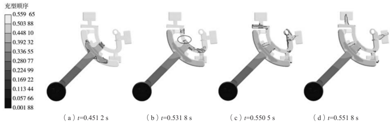 图4 方案一充型过程模拟结果 方案二的充型过程如图5所示。金属液由直浇道进入横浇道,在t=0.451 2 s时,通过主内浇道进入铸件型腔,冲击弧面壁后液流沿弧面壁上下流动;在t=0.531 8 s时,金属液通过两分支浇道进入铸件型腔,主浇道处金属液在其浇道左侧受型芯阻碍流动缓慢,如图5圈中所示,这可能导致涡流和卷气的产生。在t=0.550 5 s时,铸件弧面区域充填完成,金属液向铸件两侧末端充填。在t=0.551 8 s时,金属液充填完毕,型腔被完全充填,无充填空缺。从整个充填过程看,方案二受型芯阻碍影响先充填套筒连接区域,且充填过程存在一定程度飞溅,飞溅影响区为铸件外观面;金属液流动受弧面筋板影响,部分区域存在卷气和涡流;金属液在铸件外观面汇流,且对应区域无法设置溢流槽。