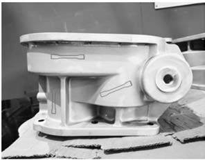 图13 检测结果图 为了检验铝合金变速箱箱体的力学性能,对其进行拉伸性能测试和硬度测试。同理,正确的取样位置能够综合反映出箱体不同部位的力学性能,选择在箱体相对平整、壁厚变化不大的位置进行取样,取样部位如图14所示。铝合金变速箱箱体力学性能测试的结果如表5所示。
