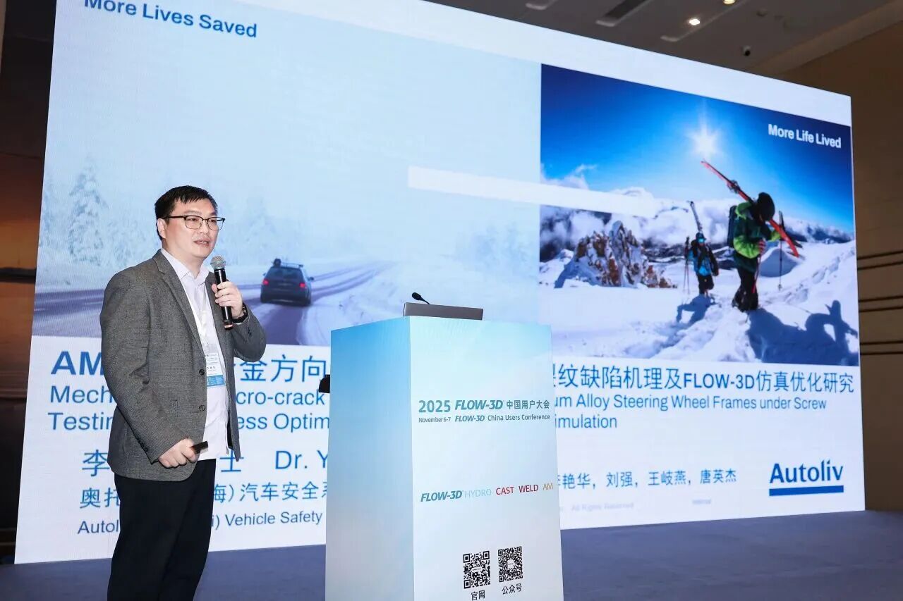 奥托立夫(上海)汽车安全系统研发有限公司李艳华博士,以《AM50A镁合金方向盘骨架扭矩试验微裂纹缺陷机理及FLOW-3D仿真优化研究》为题作报告;