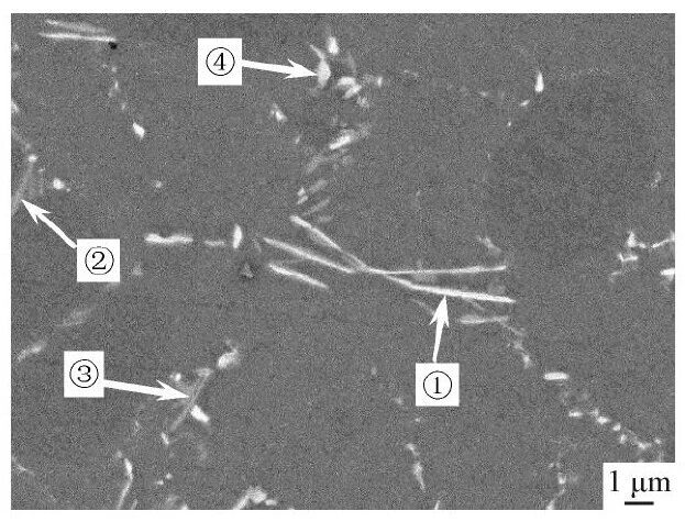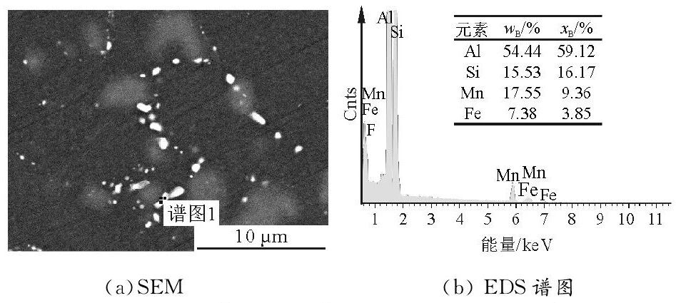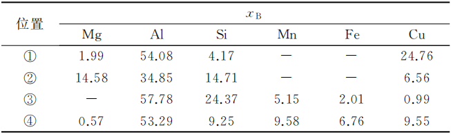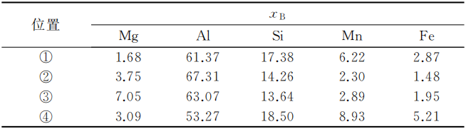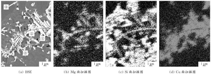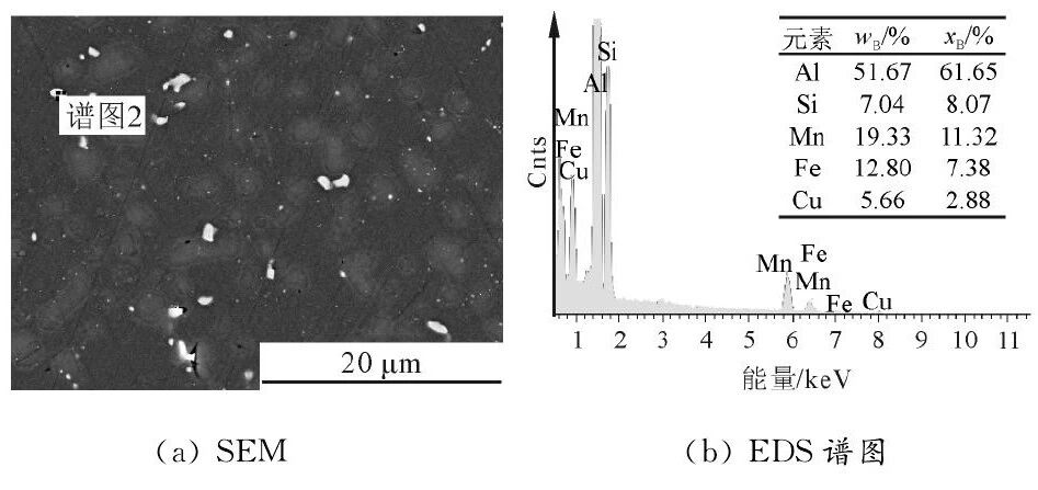 图7 T6态2号合金的SEM和EDS分析 图8为铸态3号合金的BSE图像。可以看出,在晶界有大量的白色和灰色长条状化合物。各化合物的EDS分析结果见表3。可见, 化合物 (1) 为θ-Al2Cu相, (2) 为Q-Al5Cu2Mg8Si6相, (3) 和 (4)是α-Al15(FeMn)3(SiCu)2。图9为3号合金的SEM和EDS结果。可以看出,经过T6热处理后,Q-Al5Cu2Mg8Si6相和α-AlFeMnSiCu相亦球化为细小的颗粒状。