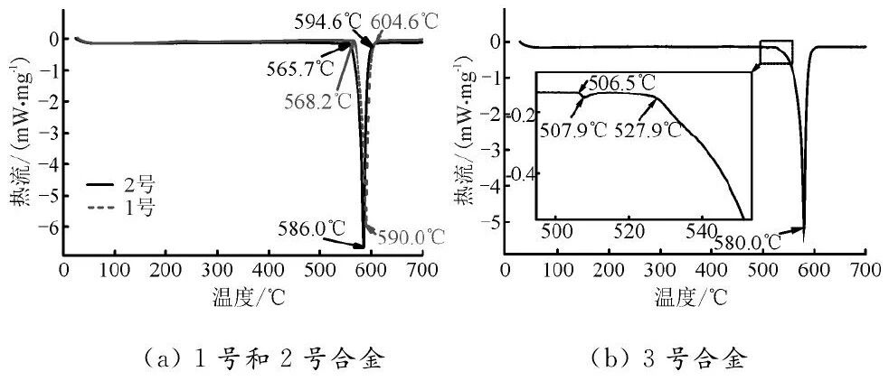 图2 1~3号合金的升温过程DSC曲线