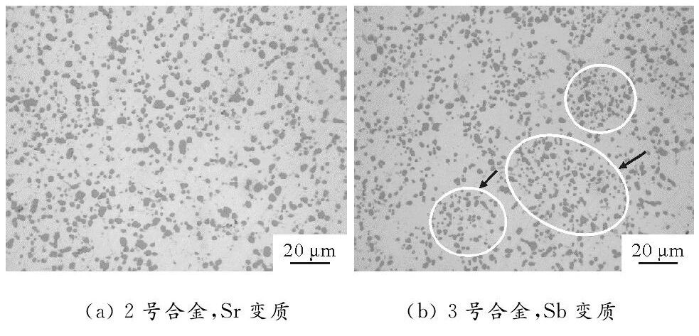 图4 挤压铸造标准力学性能试棒T6处理后的宏观照片 挤压铸造成形过程充型平稳、卷气少, 同时在半固态凝固区间对铸件施以高压压力补缩,使得铸件组织致密,可以进行完整的T6热处理以大幅提高合金的力学性能。图4为标准力学性能试样经T6处理后的照片。可以看出,挤压铸造的试棒分别在520、530和540℃下固溶处理时,表面完好,没有起泡的迹象,而采用高真空压铸 (真空度为93kPa) 制备的AlSi10MgMn合金的最高固溶处理温度仅为520℃,温度进一步升高则会出现明显的鼓泡。 图5为挤压铸造AlSiMgMn合金的T6态微观组织。可以看出, 经过T6热处理后,Sr变质合金中的共晶Si几乎完全转变为近球形或球形颗粒 (见图5a) ;而Sb变质合金组织中,少量共晶Si仍呈5~10μm的蠕虫状(见图5b箭头所示),尽管热处理后大部分共晶Si的球化效果较好,但存在较为明显的共晶Si偏聚区域 (见图5b圆圈处) , 这是共晶团变质不均匀所致。