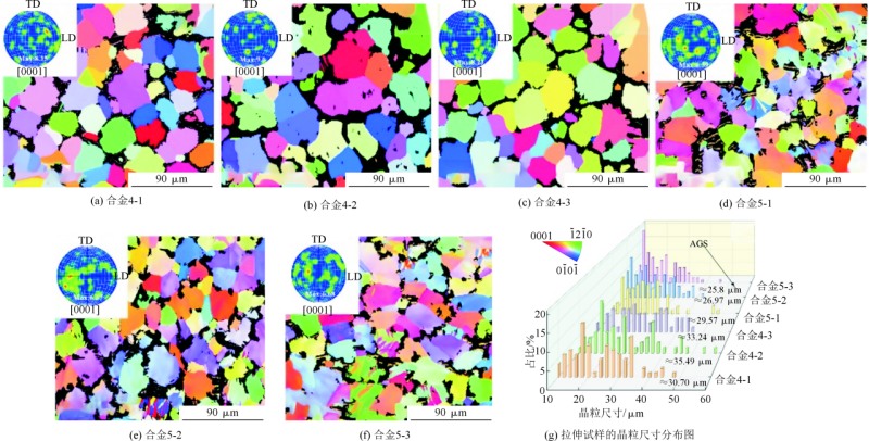 图14 合金不同位置的IPF图和晶粒尺寸分布图