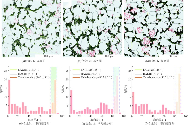 图15 不同位置的 T4-8合金4 的晶界图和取向差分布图