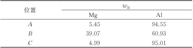 图1 拉伸试样尺寸示意图 图2为铸态AM合金的OM和SEM微观组织。可以看出,铸态AM合金晶粒粗大,平均晶粒尺寸为550 μm。同时,在晶粒内部观察到了羽毛状枝晶组织。在铸态AM合金的SEM微观组织中观察到了平均尺寸为5 μm的块状第二相,且存在孔洞缺陷,见图2b。对A点基体和B点第二相进行EDS分析(见表2)。结果表明,块状第二相由Al和Mg组成,为Al-Mg相,且两者比值接近3∶2。结合研究分析,判断铸态AM合金中的Al-Mg相为Al3Mg2相。此外,对图2b中白框区域进行EDS面扫分析,见图3。可以看出,铸态AM合金内的Mg在基体中分布不均,偏析现象严重。