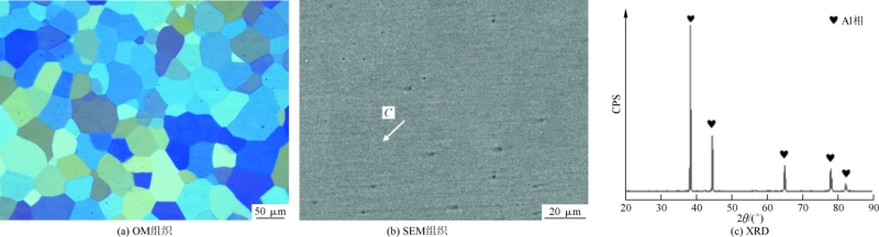 ![]() 原标题:连续流变挤压高Mg含量Al-Mg合金的组织与性能 Al-Mg合金具有较高的比强度、良好的耐蚀性和可焊性,在空天、船舶及运输等领域应用广泛。固溶的Mg对Al有较强的强化作用,在一定范围内,Al-Mg合金的强度随Mg含量的增加而提高,因此高Mg含量Al-Mg合金在上述领域具有极大的应用潜力。 《中国制造2025》发展战略的提出,对Al-Mg合金的综合力学性能提出了更高的要求。在常规铸造或连铸连轧过程中,当Mg含量较高时,Al-Mg合金的凝固组织主要由粗大的枝晶和脆性共晶Al3Mg2相组成。枝晶组织在后续变形过程中难以消除,导致合金变形困难。同时,Al3Mg2相也会在变形过程中割裂基体,引发合金脆性,降低合金的成材率和力学性能。因此,调控高Mg含量Al-Mg合金中的枝晶和第二相至关重要。为了消除枝晶和细化第二相,研究者进行了大量的探索,目前主要集中在凝固、热处理以及塑性变形等过程进行调控。然而,当前调控方法均存在成本高、流程长、调控效果有限等问题。因此,高效、低成本地细化高Mg含量Al-Mg合金中枝晶和第二相仍是行业亟待解决的问题。由于Al-Mg合金中Mg的固溶度对温度很敏感,在共晶温度450 °C时,其最大固溶度约为17.4%,在室温时仅约为2.3%。因此,采用连续流变挤压等非平衡快速凝固的方法制备该系合金,可以充分发挥Mg的固溶强化作用,降低脆性相对力学性能的损害,从而提高Al-Mg合金的性能。 本研究以Al-5Mg合金为对象,利用连续流变挤压过程中摩擦剪切与冷却的耦合作用,制备出高性能合金杆坯,对比铸态和连续流变挤压态合金的微观组织,重点研究合金微观组织演化引起的力学性能变化,旨在为高Mg含量Al-Mg合金中粗大枝晶与脆性第二相的短流程调控提供参考。 图文结果 采用质量分数为99.99%的高纯Al和高纯Mg为原料制备Al-5Mg合金(以下简称AM合金)。首先,采用稀盐酸去除原料锭表面的油污及氧化物,清洗烘干后备用。将高纯Al放入T-CM-40型井式电阻炉配套的高纯石墨坩埚中,随炉加热至750 ℃保温,待其完全熔化后,采用钛合金压料罩将高纯Mg快速压入熔体中,并缓慢搅拌。当高纯Mg块完全熔化后,采用C2Cl6对熔体进行精炼处理,并保温20 min使熔体内部成分均匀。最后,将合金熔体分别浇入尺寸为ϕ70 mm×100 mm的304不锈钢铸造模具和自主研发的CRE300型连续流变挤压机中进行重力铸造和连续流变挤压成形。挤压轮和挤压模具直径分别为ϕ300 mm和ϕ9.5 mm。采用PerkinElmer Avio500电感耦合等离子体发光光谱仪对制备的AM合金进行成分检测,实测成分见表1,其中Mg含量略低于名义成分,主要原因为熔炼过程中的元素氧化烧损。 将铸态及连续流变挤压态AM合金分别沿距底部15 mm处的中心位置和挤压方向切割为横截面为10 mm×10 mm的试样块,经机械研磨和抛光后,利用电解液(HF、HBF4、C2H6O体积比为1:4:95)对试样块进行阳极覆膜,覆膜电压为25 V。采用配备偏光模块的Olympus BX 53M光学显微镜和Zeiss Ultra Plus场发射扫描电镜对试样块进行显微组织观察及EDS能谱分析;采用Bruker D8 Advance型X射线衍射仪进行XRD分析,使用Williamson-Hall法计算位错密度;使用Image-Pro Plus软件统计合金的平均晶粒尺寸;采用Shimadzu AG-Xplus电子万能试验机测试合金的拉伸性能,拉伸速率为1.8 mm/min,棒材试样的尺寸示意图见图1;采用SIOMM HVD-1000MP多功能数显硬度计测试合金的维氏硬度,施加载荷为1.96 N,加载时间为10 s。 表1 制备的AM合金实测化学成分(%)