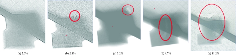 刷涂涂料B的砂芯在恒温恒湿房烘干保存4 h,砂芯涂层含水率基本稳定在1.3%~1.5%后转入铸造车间,同样在铸造车间放置3 h,每1 h检测1次,结果见表5。 两种不同涂料涂层的砂芯在恒温恒湿房烘干保存4 h后转入铸造车间,其砂芯涂层的含水率受到涂层中酒精吸潮性和无机砂水玻璃强吸湿性的影响,在2 h内会逐步升高,而后受模具温度等环境因素的影响,砂芯的含水率会逐步降低。其中涂层中酒精比例的含量对含水率影响明显,酒精比例越高,在砂芯转入生产车间后,砂芯涂层吸潮性越强,含水率升到最高所用时间越短;酒精比例越低,砂芯涂层的吸潮性越弱,升到含水率最高所用时间越长。因其酒精比例高,A涂层的吸潮性明显高于B涂层,在生产的3 h内,A涂层的含水率在1.3%~1.9%波动,B涂层的含水率在1.3%~1.7%范围内波动。 刷涂A涂层和B涂层的砂芯均在恒温恒湿房保存4 h后转入铸造车间开始浇注,在3 h内浇注完成,后处理后的铸件经X射线探伤,探伤合格率为100%,见图5。 因此,砂芯A涂层含水率在1.3%~1.9%间波动,不会导致铸件在图5位置气孔的产生;砂芯B涂层的含水率在1.3%~1.7%波动也不会导致铸件在图5位置气孔的产生。取一批砂芯在恒温恒湿房保存时间小于4 h,砂芯涂层的含水率在2.0%、2.1%、3.2%、4.7%和11.2%,直接进行生产验证并探伤检测,检测结果见图6。 表5 砂芯涂料B涂层在铸造车间含水率变化