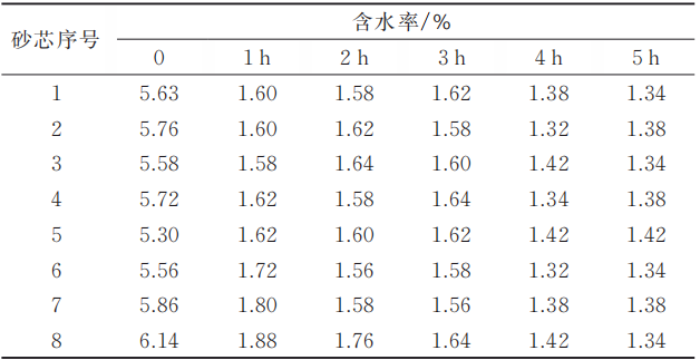 图4 无机砂制芯流程 表4 砂芯涂料A涂层在铸造车间含水率变化