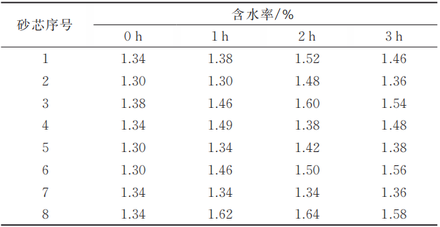 取刷涂涂层A的砂芯,从0开始检测,每间隔1 h检测1次含水率,共检测6次,结果见表3。可以看出,在烘干过程中,砂芯的含水率(ω)随时间延长而降低。在保存4 h后,砂芯涂层的含水率趋于稳定,保持在1.3%~1.5%范围内。 因水玻璃砂型对环境湿度十分敏感,在较高湿度环境下水玻璃砂具有强吸湿性,同时酒精在空气中也有较强的潮解性,因此砂芯转入铸造车间后,砂芯含水率出现了一定比例的变化。参照生产节拍,单车砂芯预计在3 h内使用完,将刷涂涂层A的砂芯在恒温恒湿房放置4 h,砂芯涂层含水率基本稳定在1.3%~1.5%后转入铸造车间,放置3 h,每间隔1 h检测1次砂芯含水率,结果见表4。 表3 砂芯涂层含水率随烘干时间的变化值