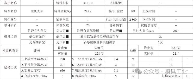 图9 模具结构 1.压室 2.分流锥 3.定模板 4.动模板 5.垫块 6.支撑柱 7.推板 8.推杆固定板 9.复位杆 10.斜导柱 11.型芯镶件 12.型腔板镶件 13.弹簧 14.拉杆 15.滑块 16.滑块 17.滑块 3.2 模具成型零件 型芯镶件11、型腔板镶件12、滑块15~17都采用进口合金钢8418制造,8418模具钢是一种含铬、钼、钒的高性能热作模具钢,具有较好的抗热疲劳龟裂、热冲击开裂、热磨损、塑性变形的性能,这些性能使其成为压铸、热锻、热挤压模用钢的最优选择。模具零件粗加工后热处理前须进行去应力处理,淬火硬度为46~48 HRC。模具零件加工完成后,对型芯、型腔板镶件进行喷丸强化处理,喷丸强化处理是专门针对压铸模零件的表面处理技术,其主要目的是提高模具零件的耐磨性、抗腐蚀性和热疲劳性能,以延长模具的使用寿命。型芯及型腔板镶件外形尺寸应比动、定模框小0.05~0.08 mm,四角定位配合公差为0.03~0.05 mm。 3.3 铸件成型 模具装配及经过质检合格后,且保证开合模各个动作(开合模、推出等)顺畅后试模,根据铸件信息及压铸机参数,设定第1次试模参数,如表2所示,第1次试模样件,如图10所示。 表2 试模报告