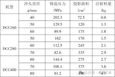 图3 成型难点分析 2.2 成型设备匹配 铸件质量为285.9 g,成型投影面积为16 935 mm²,结构复杂,型腔末端充填困难,模具需设计多滑块抽芯。铸件的强度要求高,需要较高的锁模力以及压力,结合压铸机参数(见表1所示),选定DCC280T冷室压铸机为成型设备,配备直径φ60 mm的冲头。 表1 压铸机参数