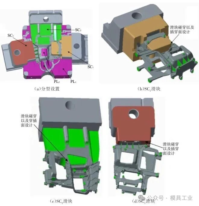 2.3 成型方案设计 根据技术要求分析,分型设置如图4(a)所示,深色面为主分型面PL1,其中包含碰穿面PL2,PL2面打开方向为开模方向,与开模方向垂直的区域设置SC1、SC2、SC3三个侧向抽芯,其中SC1滑块如图4(b)所示,SC2滑块如图4(c)所示,SC3滑块如图4(d)所示。