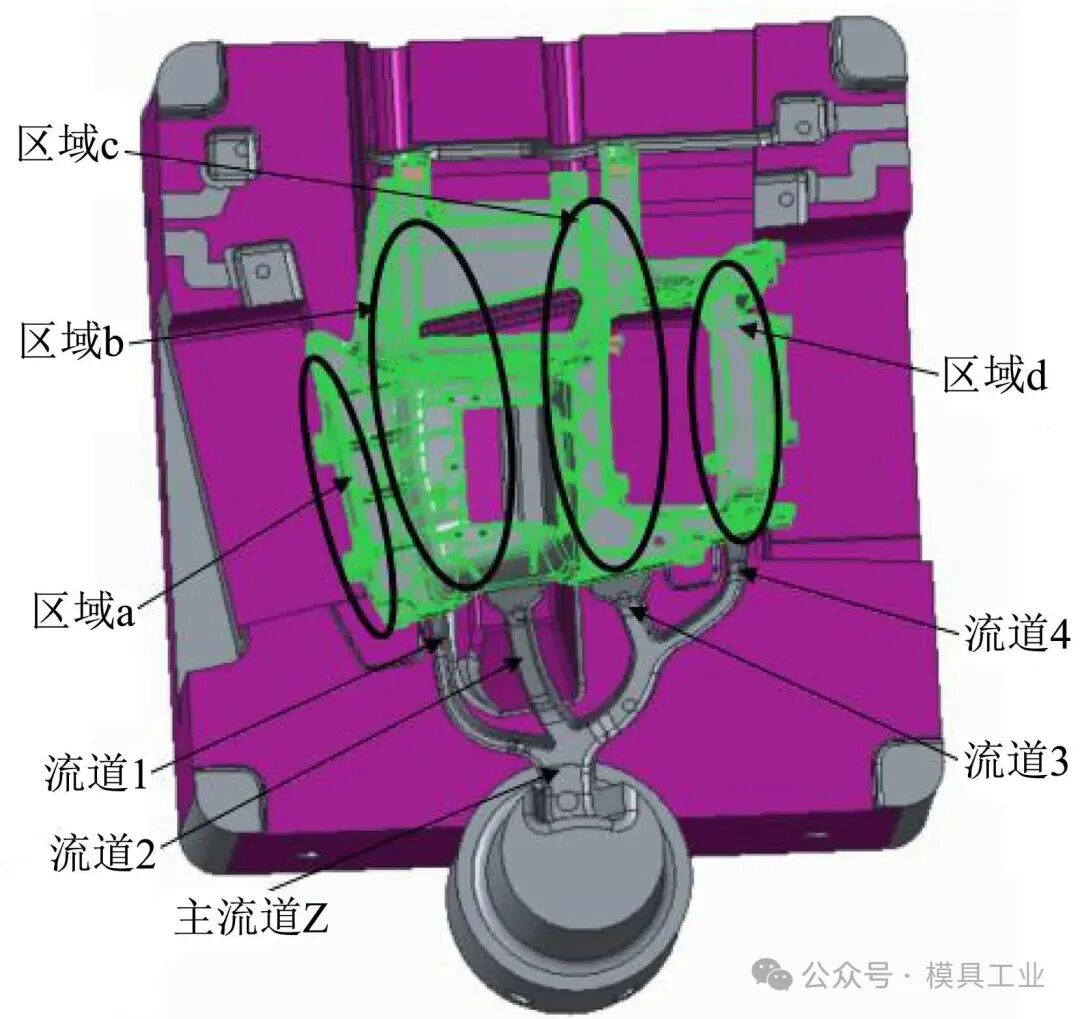 图4 分型设计 浇注系统设计如图5所示,主流道Z负责控制整个浇注系统的流量,其横截面尺寸为25 mm×11 mm。遵循主流道横截面大于分流道设计原则,即Z>1+2+3+4,其中分流道为1、2、3、4,分流道浇注系统中设置1、2、3、4流道分别对区域a、b、c、d进行充填。流道1为辅助流道:流道截面尺寸为7 mm×6 mm,内浇口截面尺寸为1.6 mm×8 mm,负责补充流道2因分型面爬坡的压力损失。流道2为主流道,负责区域b的充填,流道截面尺寸为10 mm×8 mm,内浇口截面尺寸为1.2 mm×25 mm。流道3为次主流道,负责区域c的充填,流道截面尺寸为10 mm×8 mm,内浇口截面尺寸为1.2 mm×20 mm。流道4为辅助流道,负责区域d的充填,流道截面尺寸为8 mm×6 mm,内浇口截面尺寸为1.2 mm×9 mm。
