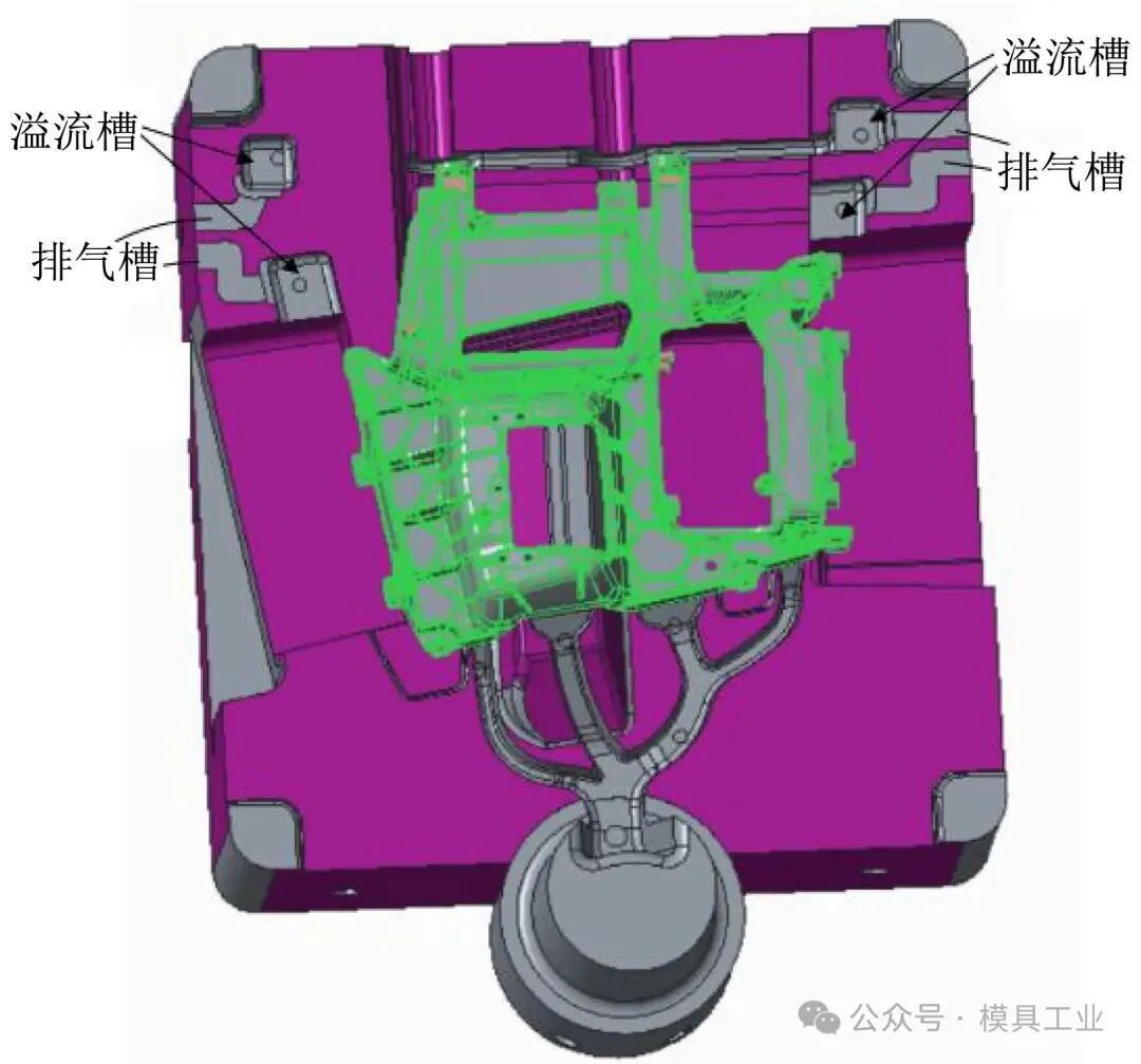 图5 浇注系统设计 针对4股流道进料及铸件笼式加强筋结构易引起多股料流在交汇处产生冷料的问题,如不能及时将冷料排出型腔,会导致铸件表面产生冷隔纹,内部引起缩孔、困气等,甚至影响其强度导致断裂,因此在型芯侧设计了4个25 mm×25 mm×12 mm溢流槽和4个12 mm×0.1 mm排气槽,如图6所示。在型腔顶部加强筋内侧设计了25 mm×25 mm×5 mm溢流槽,其侧壁脱模斜度为30°,底部倒R3 mm圆角,靠溢流槽内浇口带出成型铸件,为了顺利带出成型铸件,内浇口尺寸设计为20 mm×1 mm,用于及时排出流道2、3交汇的冷料。在型芯对应的型腔板位置也开设相应的溢流槽以增加排渣的容量,如图7所示。