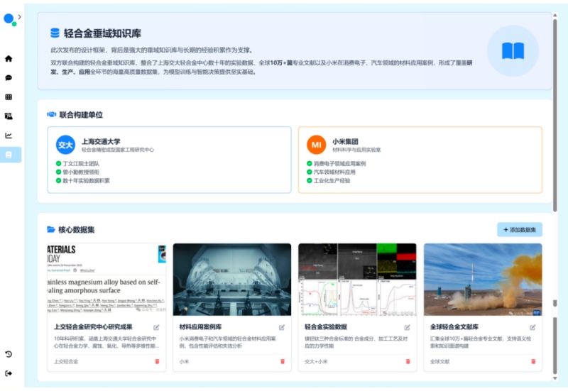 ![]() 轻合金材料在航空航天、汽车、消费电子等领域具有广阔的应用前景,其突破性创新已成为全球高端制造竞争的核心焦点。针对轻合金材料设计方法面临的组分工艺复杂、研发生产应用流程长,评价维度多样等难点,上海交通大学正式联合小米集团发布轻合金大模型多智能体设计平台,构建AI驱动轻合金全链条智能研发体系,助力轻合金材料研发范式变革。 组分工艺复杂:DeepLight推理驱动,重构轻合金研发范式 轻合金材料组分工艺复杂,其研发长期依赖传统实验试错,一款高性能合金材料的研发需要以年为单位的时间。轻合金大模型DeepLight以垂域知识推理为驱动,大幅提升轻合金研发效率,将轻合金设计推向人工智能驱动的"第五范式"。 针对轻合金“成分—工艺—性能”关系强耦合、跨尺度机理复杂导致的外推预测难、推理难度高等行业关键瓶颈,团队构建了面向轻合金特性的链式推理数据体系。该体系融合材料组分、微观结构、相变行为、组织演化与力学性能等多维度知识,通过监督微调与强化学习技术,使模型能够稳定构建跨尺度推理路径、捕捉复杂的非线性结构—性能关系,从根本上提升了轻合金垂域的推理质量。 团队依托DeepLight的推理能力,已成功研制出超强耐蚀镁合金,其耐腐蚀性能达到目前公开报道中的最佳水平,为镁合金在汽车、航空等高要求领域的工程化应用打开了新的可能。 性能预测,点击查看相关视频 研发生产应用流程长:AgentMat多智能协作,驱动全流程设计革新 如果说DeepLight是轻合金研发的"智慧大脑",那么AgentMat多智能体协作框架就是打通全流程的"高效中枢"。针对轻合金研发生产应用流程长所带来的前沿跟进困难、落地应用时模型专家协作困难等诸多问题,该框架将材料研发拆解为知识获取、数据分析、方案生成、工具调用与验证、专家协作等智能体,通过智能体间自动化的高效协作实现从研发到实际应用的顺畅落地。 AgentMat的协作机制可以有机结合DeepLight模型、内部积累的小模型和理论预测工具、专家判断与反馈等多维度信息,交叉验证优化方案可行性。以镁合金研发为例,AgentMat可在1小时内完成从需求分析到新设计方案输出的全流程,并推送给材料科学家与工程师进行高效协同,较传统模式效率提升10倍以上。目前,该框架已在智能体驱动的自动化合金实验平台完成初步部署,实现了"模型预测-实验验证-数据反馈"的AI自主闭环迭代,未来可快速适配到汽车、航空航天等领域的实际生产场景中。 【智能设计】实验报告生成,点击查看相关视频 【智能设计】配方结果生成,点击查看相关视频 缺乏评价指标:LightAlloy-Bench评测基准,树立轻合金设计方法度量衡 轻合金评价维度多样,其设计方法缺乏统一、权威的评测标准。上海交大轻合金中心依托其在领域的深厚积淀,构建了国内首个覆盖镁、铝合金全场景的专业评测基准,为轻合金材料AI模型提供了科学、精准的"度量衡"。 该评测基准LightAlloy-Bench面向轻合金大模型能力验证,涵盖材料基础知识掌握与性能推理两大维度、多项关键指标。研发团队不仅系统整合了丁文江院士、曾小勤教授领衔的轻合金精密成型国家工程研究中心团队长期积累的研究数据,还广泛收集了轻合金领域近20年的公开文献数据,构建了业内首个覆盖体系最全、知识链最完整的轻合金领域评测数据集。DeepLight在该评测集上取得了最优表现,较DeepSeek-V3与GPT-4o通用大语言模型提升近 20%,展现出在轻合金知识理解、机理推断与性能预测任务上的显著优势。