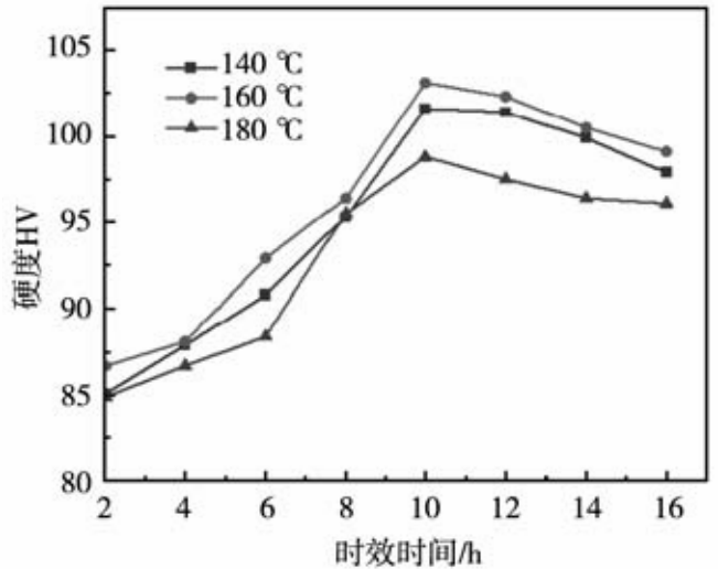 图6 T6态合金Mg2Si相和Al3Sc相的TEM照片 2.5 热处理对合金力学性能的影响 图7为不同时效工艺下合金硬度-时间曲线。从图中可以看出,随着时效时间的增加,不同时效温度试验合金的硬度均呈现先升高后降低的趋势,并且均在10 h达到峰值。合金硬度值升高主要是因为基体中析出了Al3Sc和Mg2Si硬质相。其中160 ℃时效10 h后的平均硬度值最高,达到HV 103.1。因此本试验合金确定的最优热处理制度为530 ℃固溶6 h后水淬,再进行160 ℃时效10 h。