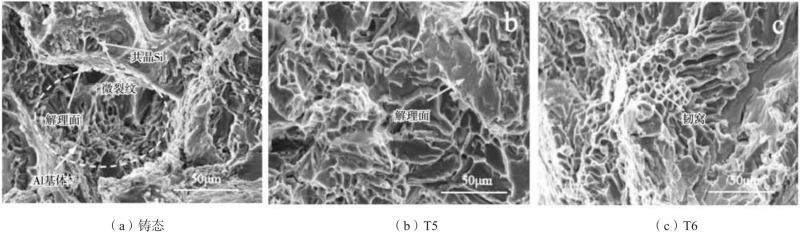图8 不同状态下试验合金拉伸性能 图9为不同状态下合金的断口形貌。图9(a)为铸态合金断口形貌,可以看出在晶界附近的较宽共晶组织(α-Al+Si)区域中,共晶Si发生断裂形成了微裂纹,微裂纹沿着共晶组织与基体界面继续扩展,导致在界面处形成了较大的断面,同时,基体中存在少量韧窝。图9(b)为固溶处理后合金的断口形貌,相较于铸态合金,断口处韧窝的数量明显增多,合金塑性得到提高。但断口形貌存在明显的解理面,这可能是由于微裂纹穿晶扩展造成的。从T6态合金断口形貌(图9(c))可以看出,韧窝的数量及深度明显增大,但仍存在部分解理面,此过程中共晶Si进一步球化,减小了对于基体的割裂作用,同时组织中也析出了层片状的硬质相Mg2Si。在拉伸过程中Mg2Si无法协调应力场,容易产生应力集中,不利于改善合金塑性。