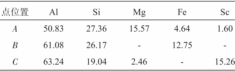 图2 试验合金的DSC曲线 2.2 SEM 分析 图3为铸态合金的SEM及EDS结果图。从图3(a)可以看出,铸态合金组织主要由α-Al、晶界附近黑色衬度的共晶Si、浅灰色衬度的含Sc相、富铁相组成。晶界附近存在尺寸较大的片状共晶Si以及较宽的α-Al+Si共晶组织区域呈半连续分布。对图3(a)中白色方框区域进行面扫分析,结果如图3(b)-(f)。分析发现Al基体中固溶了部分Si、Mg、Fe和Sc元素。呈骨骼状形貌的第二相所在位置同时富集了Al、Si、Mg和Fe四种元素,初步推断为π-AlSiMgFe相。棒状形貌的第二相则主要由Al、Si和Fe三种元素富集,确定该相为β-AlFeSi相。此外,短棒状形貌相则主要由Al、Si和Sc三种元素富集,为AlScSi三元相。表2为图3(a)中A、B和C所指位置的EDS点扫描结果,结合图3(b)-(f)面扫结果进一步确定A点位置相为π-AlSiMgFe,B点位置相为β-AlFeSi,而C点位置相为AlScSi三元相。本课题组前期研究得到该含Sc三元相为AlSc2Si2相,含Sc相的生成会消耗一部分Si和Al元素,对细化铸造铝硅合金中共晶Si相的有着重要作用。