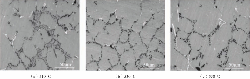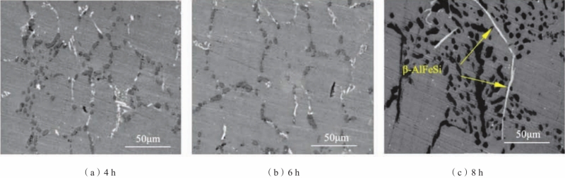 图4 不同固溶温度下合金固溶2 h的SEM照片 图5为合金在530 ℃条件下固溶不同时间的SEM照片。由图5(a)可以看出,固溶时间为4 h时,组织中共晶Si球化程度增加,且分布较为均匀。经过6 h固溶后的组织如图5(b)所示,共晶Si在晶界处均匀分布,球化程度进一步增加,共晶Si区变窄。同时,α-Al晶粒出现长大趋势。图5(c)为合金经过8 h固溶后的SEM图,分析发现共晶Si的圆整度开始下降,并出现聚集和长大现象。观察发现,位于共晶Si区的β-AlFeSi相也表现出长大趋势。因此,本工作确定的最佳固溶工艺为530 ℃固溶6 h。