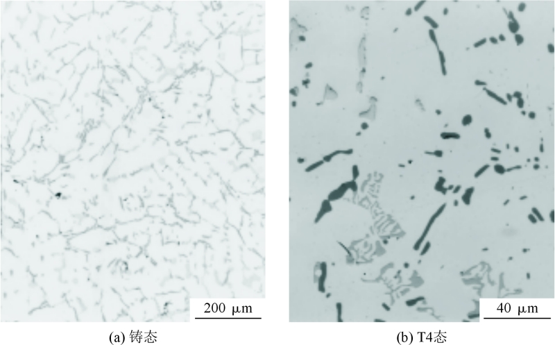 图1 铸态和T4态Al-6.23Si-3.77Cu-0.06Mg合金中共晶Si相形貌