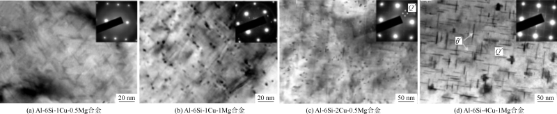 图9 不同Cu、Mg质量比的Al-6Si-xCu-yMg系合金的TEM图