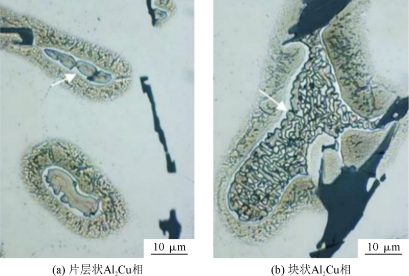 图2 Al-9.4Si-2.4Cu-0.28Mg合金中不同形态的Al2Cu相形貌