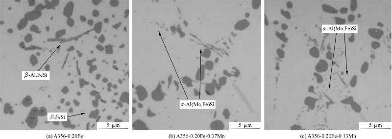 图3 A356-0.20Fe-xMn合金中β-Al5FeSi与α-Al(Mn,Fe)Si相的形态 2. 成形工艺对 Al-Si-Cu-Mg 合金的影响 成形工艺直接决定合金的缺陷率与力学性能。重力铸造成本低、工艺简单,但冷却速率慢、缺陷多,力学性能较差;压铸能提高生产效率和尺寸精度,近 70% 的铸造铝合金采用此工艺,不过压铸件易含气体,热处理时可能鼓泡,而真空压铸可减少孔隙率,使合金热处理后性能显著提升(如 AlSi10MgMn 合金经真空压铸和热处理后,屈服强度提高 30.5%)。 挤压铸造结合了铸造与塑性加工优势,能制备复杂、高精度零件,提高挤压力可细化晶粒、消除缩松气孔(如挤压力从 70MPa 升至 160MPa 时,Al-6Si-0.3Mg 合金抗拉强度从 198MPa 提至 208MPa),且可直接热处理;变形处理(如轧制、挤压)通过动态再结晶细化晶粒,例如轧制态 Al-6Si-3Cu 合金的抗拉强度较铸造态提高 105%,伸长率提高 76%。此外,半固态挤压铸造等新工艺能进一步消除偏析,提升性能。