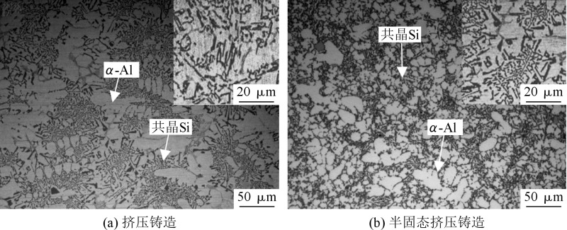 图6 挤压铸造和半固态挤压铸造Al-17.75Si-4.36Cu-0.47Mg合金组织形貌
