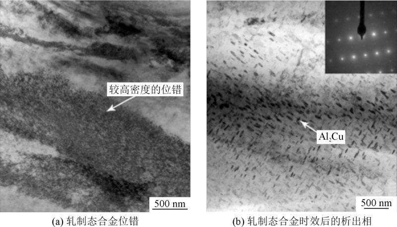 图7 轧制Al-6Si-3Cu合金的TEM图 3. 热处理对 Al-Si-Cu-Mg 合金的影响 Al-Si-Cu-Mg 合金是典型的热处理强化合金,核心在于 “固溶 + 时效”。固溶处理可改善元素偏析和 Si 相形貌,形成过饱和固溶体,为避免过烧,常采用多级固溶(如先 495℃固溶 8h,再 515℃固溶 4h);时效处理则通过析出强化相提升强度,传统析出序列为 SSSS→G.P.→β″+QC+QP→β′+θ′→θ′+Q+β,而最新研究提出新序列,认为 θ′_P2 相可直接转变为 θ′相,无需改变界面结构。 不同强化相对性能影响不同,β′相强化能力最强,Q′相次之,θ′相最弱;Cu、Mg 含量及比例会决定强化相类型,例如低 Cu、Mg 比易析出 Mg₂Si 相,高比例则促进 Al₂Cu 相形成,这些强化相与 α-Al 相、共晶 Si 相共同决定合金的微观结构与力学性能。